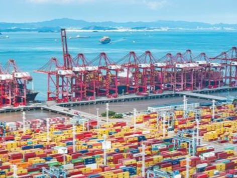 在浙江宁波舟山港大榭港区,五彩缤纷的集装箱整齐堆放在海岸,远洋货船往来不断,在海面划出一道道航迹……
