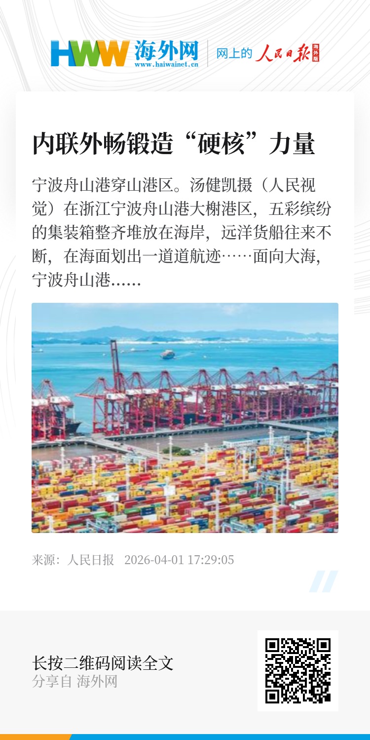 面向大海,宁波舟山港不断刷新成绩单——2025年完成货物吞吐量突破14亿吨,连续17年位居全球第一,集装箱吞吐量超4300万标准箱,稳居全球第三。内联外畅的宁波舟山港在共建“一带一路”、长江经济带发展等方面发挥着“硬核”力量。
