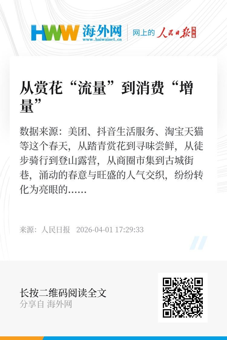 以花为“媒”、多业态融合,如今的“春日经济”不再是简单的踏青消费,而是在新场景、新产品、新服务的赋能下,连接起“吃、住、行、游、购、娱”全产业链的复合型经济形态,是体验经济的生动呈现。春光无限好,“春日经济”持续升温,既为美好生活增添更多亮色,也为经济社会发展注入新的动能。