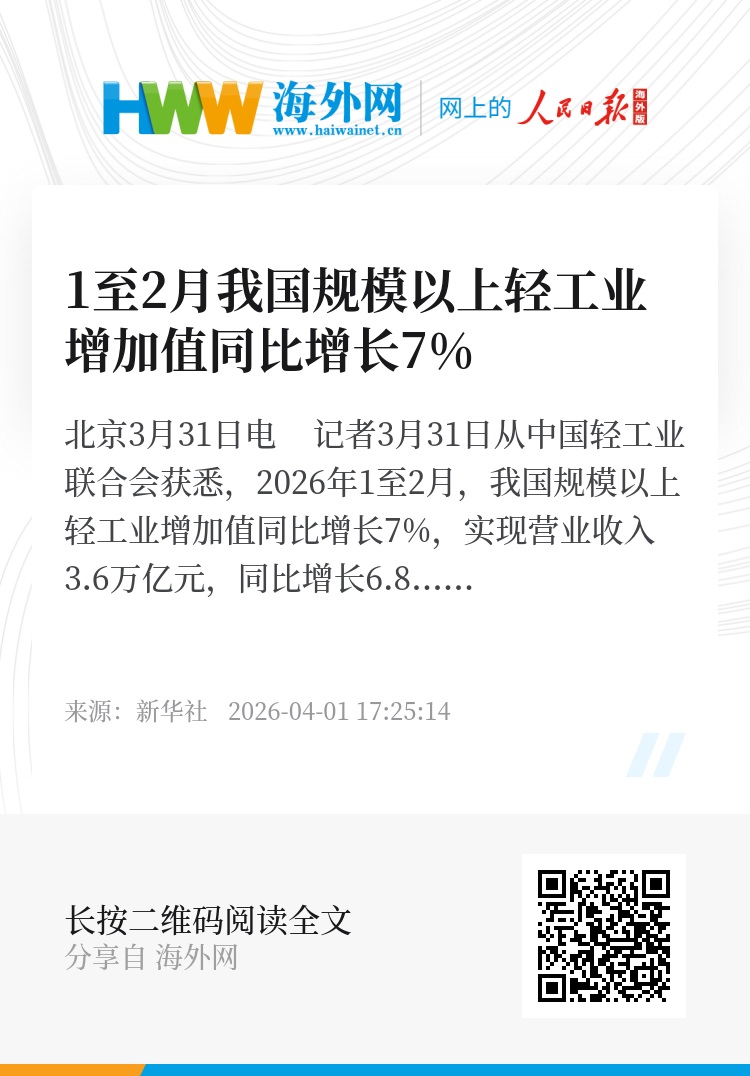 新华社北京3月31日电 记者3月31日从中国轻工业联合会获悉,2026年1至2月,我国规模以上轻工业增加值同比增长7%,实现营业收入3.6万亿元,同比增长6.8%。
