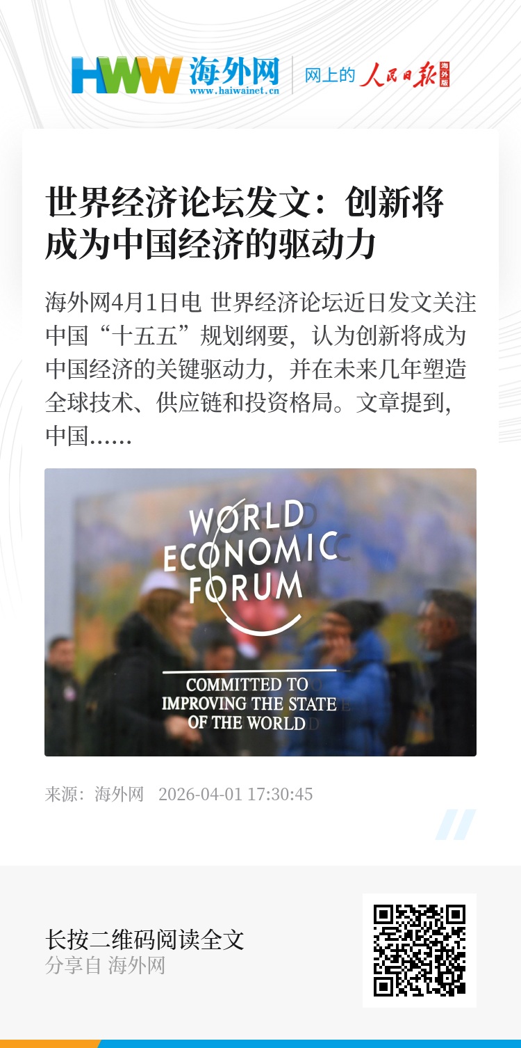 海外网4月1日电 世界经济论坛近日发文关注中国“十五五”规划纲要,认为创新将成为中国经济的关键驱动力,并在未来几年塑造全球技术、供应链和投资格局。
