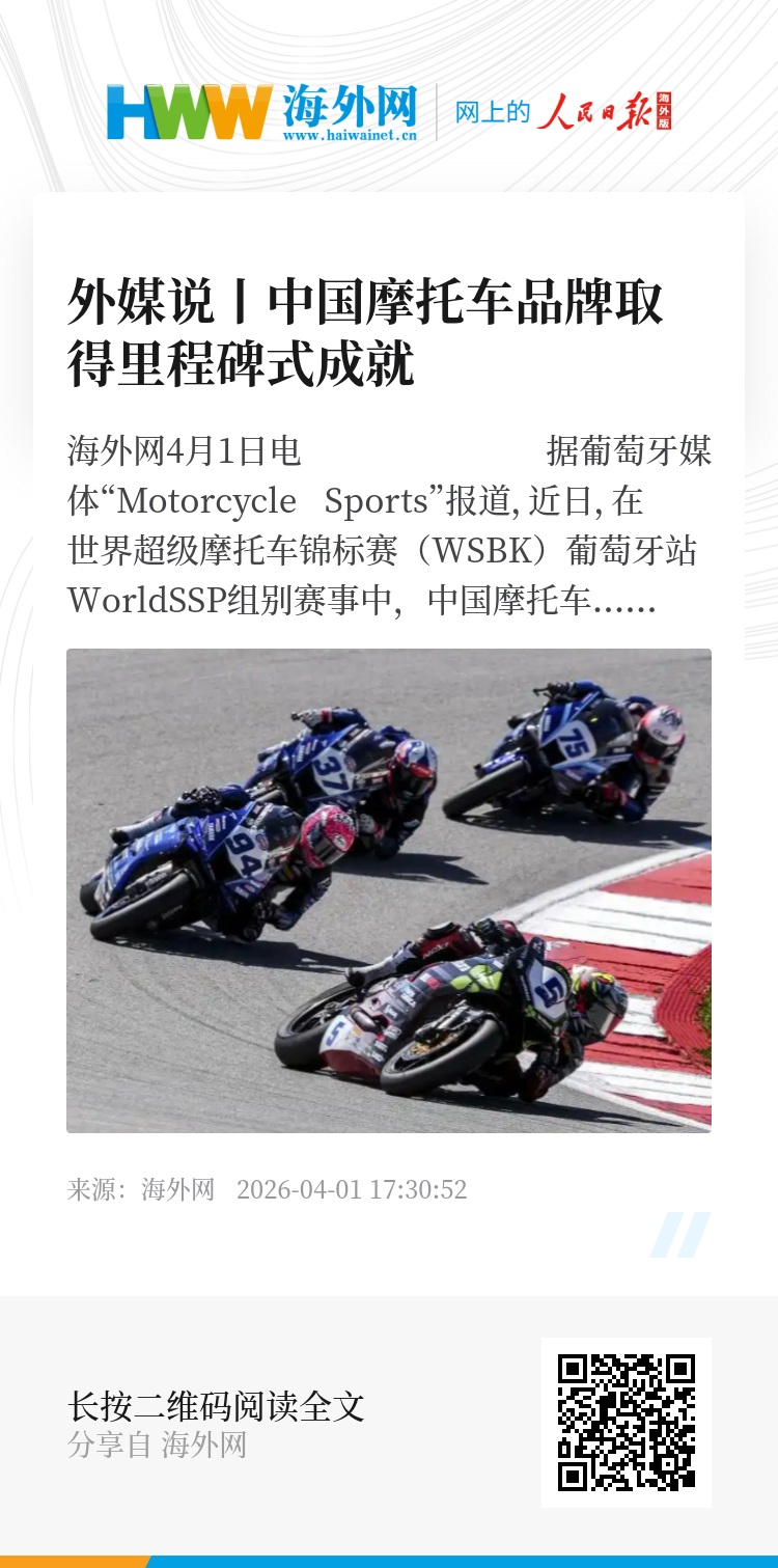海外网4月1日电 据葡萄牙媒体“Motorcycle Sports”报道,近日,在世界超级摩托车锦标赛(WSBK)葡萄牙站WorldSSP组别赛事中,中国摩托车品牌“张雪机车”取得里程碑式成就。该品牌在该站赛事双回合正赛中相继夺冠,证明其车型有实力抗衡并击败杜卡迪、雅马哈等世界老牌厂商。