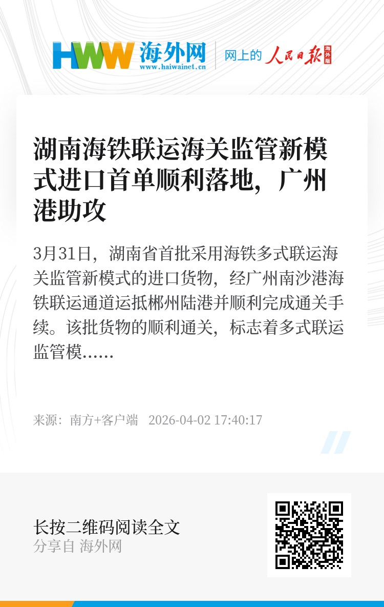 3月31日,湖南省首批采用海铁多式联运海关监管新模式的进口货物,经广州南沙港海铁联运通道运抵郴州陆港并顺利完成通关手续。该批货物的顺利通关,标志着多式联运监管模式在湖南实现进出口双向贯通,充分彰显了广州港作为粤港澳大湾区核心门户枢纽的辐射带动能力,推动湖南全省物流网络与粤港澳大湾区港口群实现深度融合。