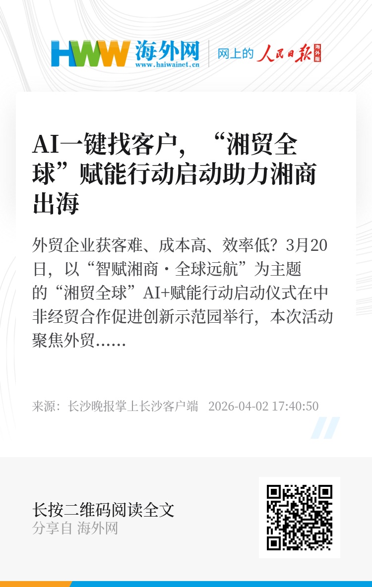 外贸企业获客难、成本高、效率低?3月20日,以“智赋湘商・全球远航”为主题的“湘贸全球”AI+赋能行动启动仪式在中非经贸合作促进创新示范园举行,本次活动聚焦外贸企业几大发展痛点,以人工智能技术赋能破局,助力全省外贸产业数字化、智能化转型升级。