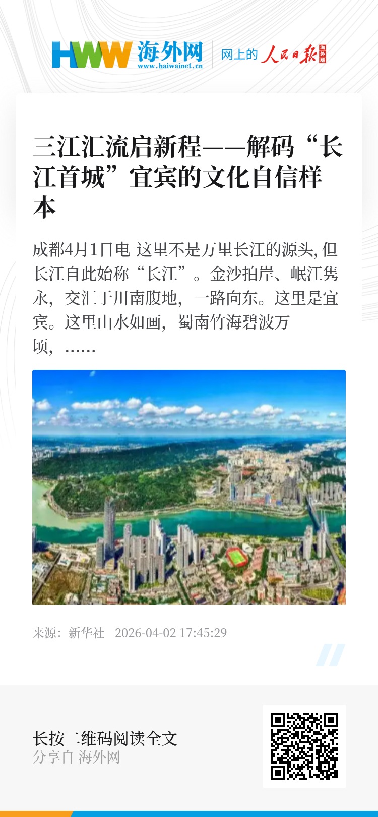 从滇南馆里的川滇旧影,到“长发升”酒坊里数百年不断的酒香;从打造僰道历史文化旅游休闲街区、长江文化主题公园,到建设四川南向开放枢纽门户、国际旅游城市——宜宾依江而兴、以包容为怀,始终以天下人为宾,让长江文脉在新时代生生不息。