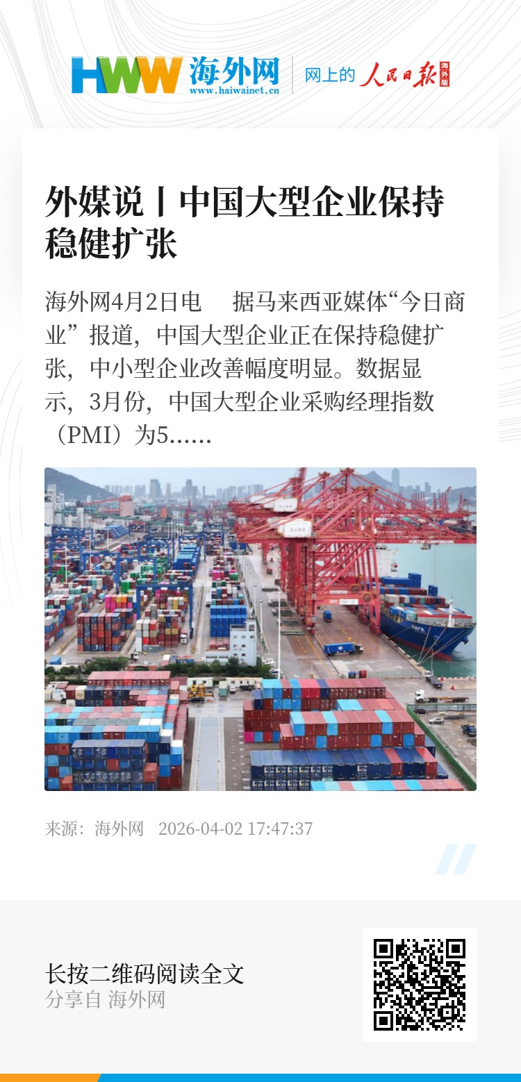 海外网4月2日电 据马来西亚媒体“今日商业”报道,中国大型企业正在保持稳健扩张,中小型企业改善幅度明显。数据显示,3月份,中国大型企业采购经理指数(PMI)为51.6%,中、小型企业PMI分别为49.0%和49.3%。(海外网 李芳)