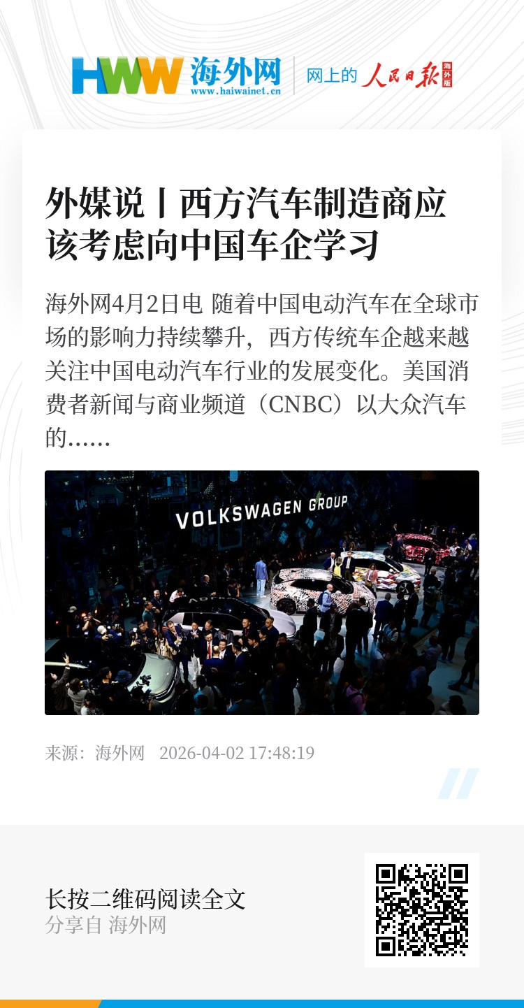 海外网4月2日电 随着中国电动汽车在全球市场的影响力持续攀升,西方传统车企越来越关注中国电动汽车行业的发展变化。