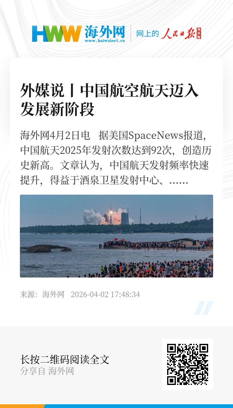 海外网4月2日电 据美国SpaceNews报道,中国航天2025年发射次数达到92次,创造历史新高。文章认为,中国航天发射频率快速提升,得益于酒泉卫星发射中心、文昌航天发射场等发射基础设施的发展完善。此外,可重复使用运载火箭技术的研发推进等,为高频发射提供了支撑。