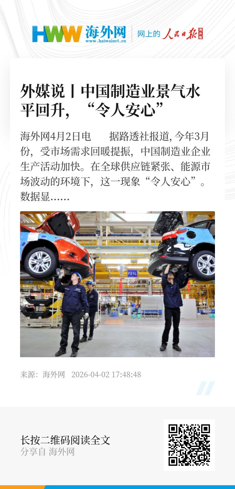 海外网4月2日电 据路透社报道,今年3月份,受市场需求回暖提振,中国制造业企业生产活动加快。在全球供应链紧张、能源市场波动的环境下,这一现象“令人安心”。