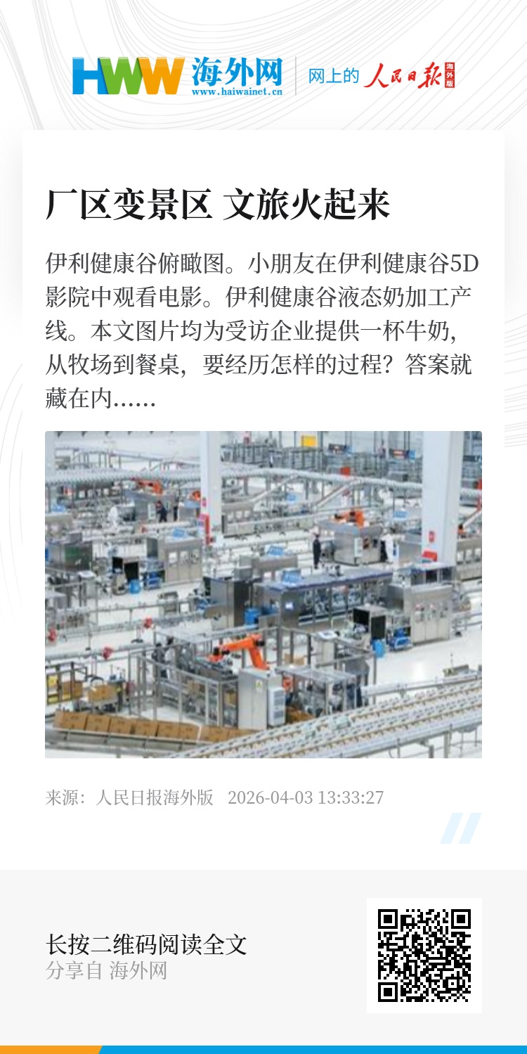 “未来,伊利将以现代智慧健康谷为枢纽,联动周边资源打造全域旅游网络,推动全国其他开放工厂旅游功能升级,并在印尼、泰国、新西兰等海外基地复制本土化模式,打造工业旅游‘金名片’。”刘春喜说。(记者 赵景锋)