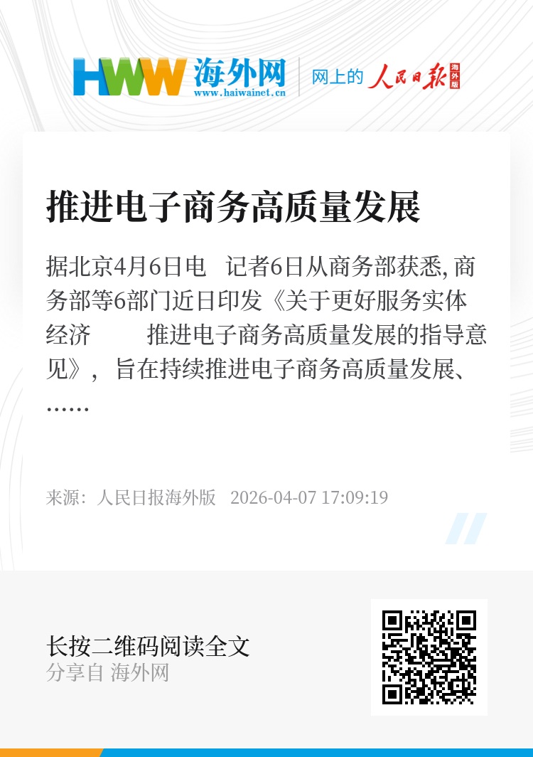 据新华社北京4月6日电 记者6日从商务部获悉,商务部等6部门近日印发《关于更好服务实体经济 推进电子商务高质量发展的指导意见》,旨在持续推进电子商务高质量发展、高水平开放、高效能治理,更好服务实体经济巩固壮大。
