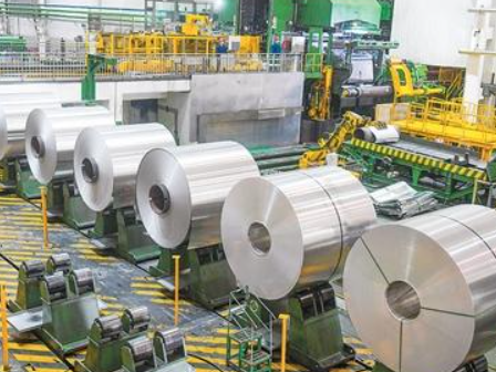 在河南省洛阳市新安县的洛阳万基铝加工有限公司车间,工人正生产一批出口海外的动力电池软包铝箔。