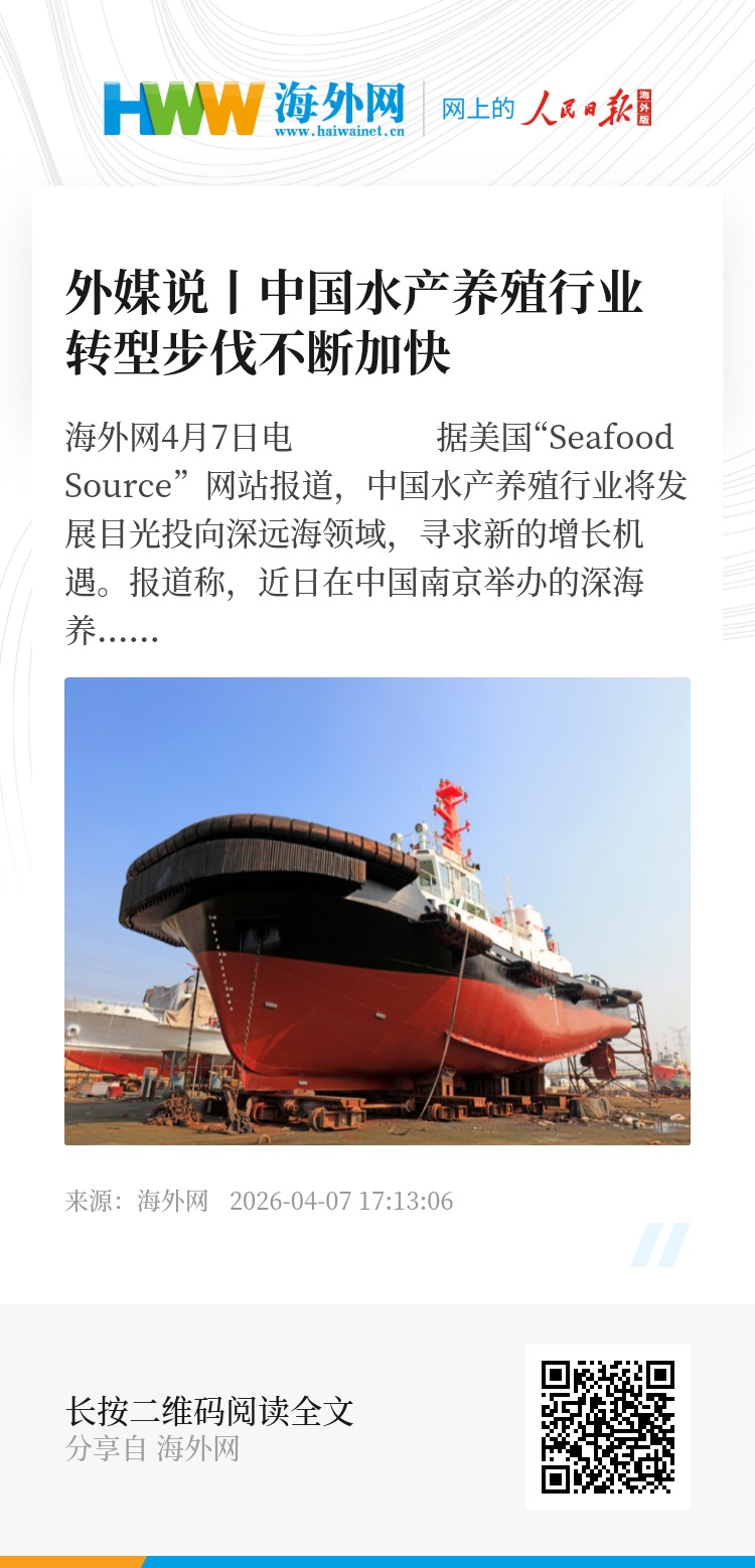 海外网4月7日电 据美国“Seafood Source”网站报道,中国水产养殖行业将发展目光投向深远海领域,寻求新的增长机遇。