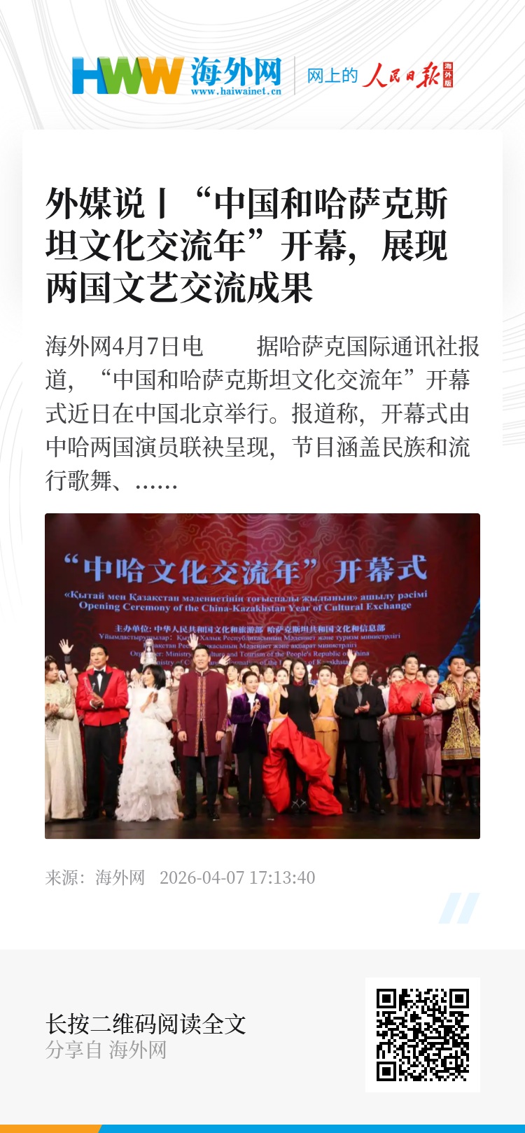 海外网4月7日电 据哈萨克国际通讯社报道,“中国和哈萨克斯坦文化交流年”开幕式近日在中国北京举行。