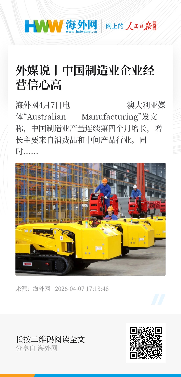文章提到,中国制造业企业的经营信心较高,支撑因素来源于客户需求进一步回暖、产能投资扩大、新产品研发推进、生产效率提升以及政府出台的扶持政策。一家市场研究机构负责人表示,尽管面临着日益复杂的国际经济环境,中国制造业仍延续扩张态势,“中国将2026年经济增长目标设定在4.5%至5%之间,这一目标基本符合市场预期。这体现了‘稳中求进’的总体政策基调,预计将为制造业发展提供支撑。”(海外网 李芳)