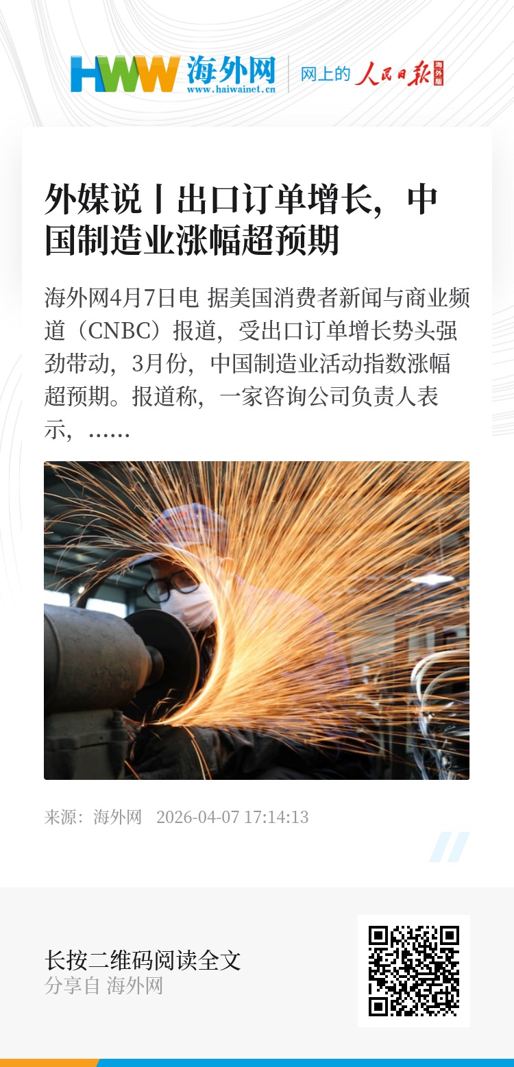海外网4月7日电 据美国消费者新闻与商业频道(CNBC)报道,受出口订单增长势头强劲带动,3月份,中国制造业活动指数涨幅超预期。