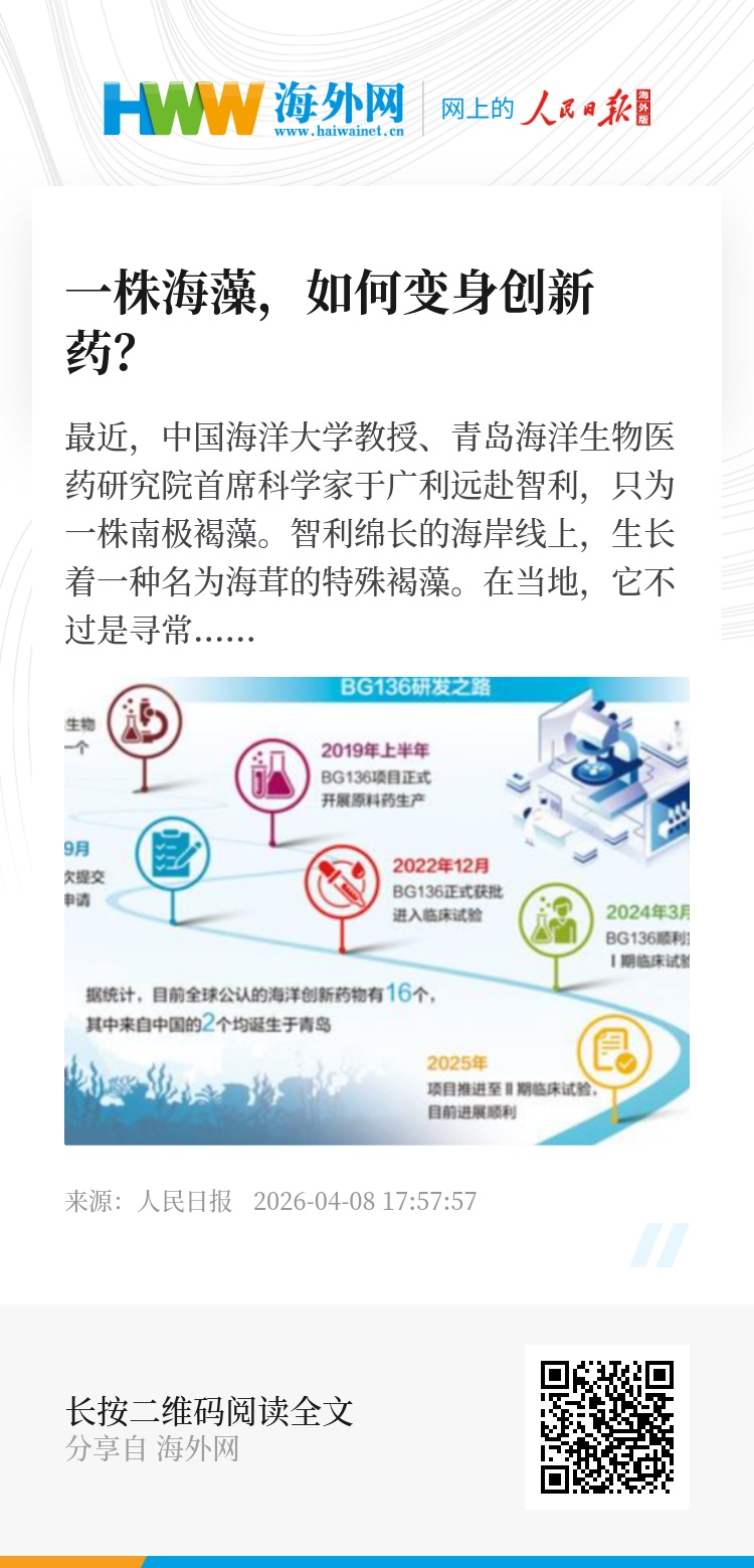 但当它跨越重洋来到我国山东青岛,其命运被重新定义——中国科研团队从中提取关键有效成分,研发出免疫抗肿瘤海洋1类新药“注射用BG136”。这是国际首个进入临床试验的免疫抗肿瘤海洋多糖类药物。