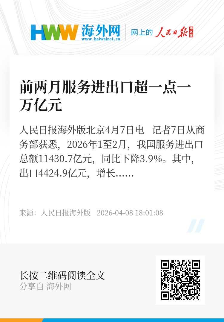 人民日报海外版北京4月7日电 记者7日从商务部获悉,2026年1至2月,我国服务进出口总额11430.7亿元,同比下降3.9%。其中,出口4424.9亿元,增长4.7%;进口7005.8亿元,下降8.7%。服务贸易逆差2581亿元,比上年同期缩小865.2亿元。