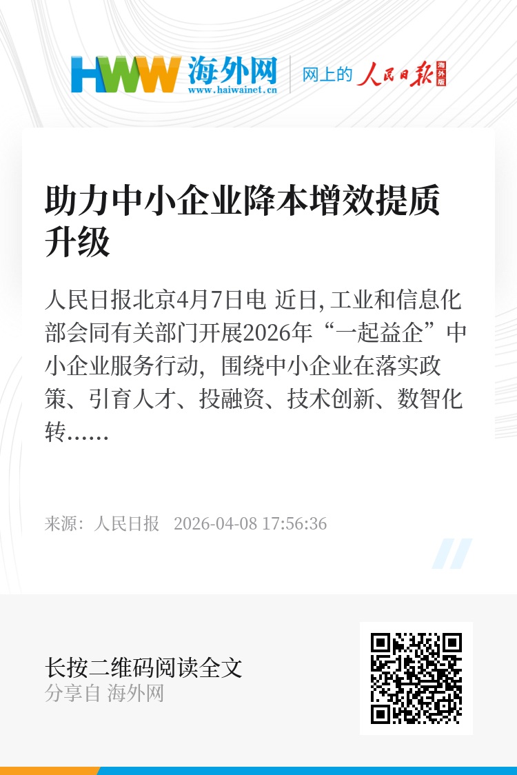 人民日报北京4月7日电 近日,工业和信息化部会同有关部门开展2026年“一起益企”中小企业服务行动,围绕中小企业在落实政策、引育人才、投融资、技术创新、数智化转型、管理提升、市场拓展等方面的痛点难点问题,推出务实服务举措,助力中小企业降本增效、提质升级。