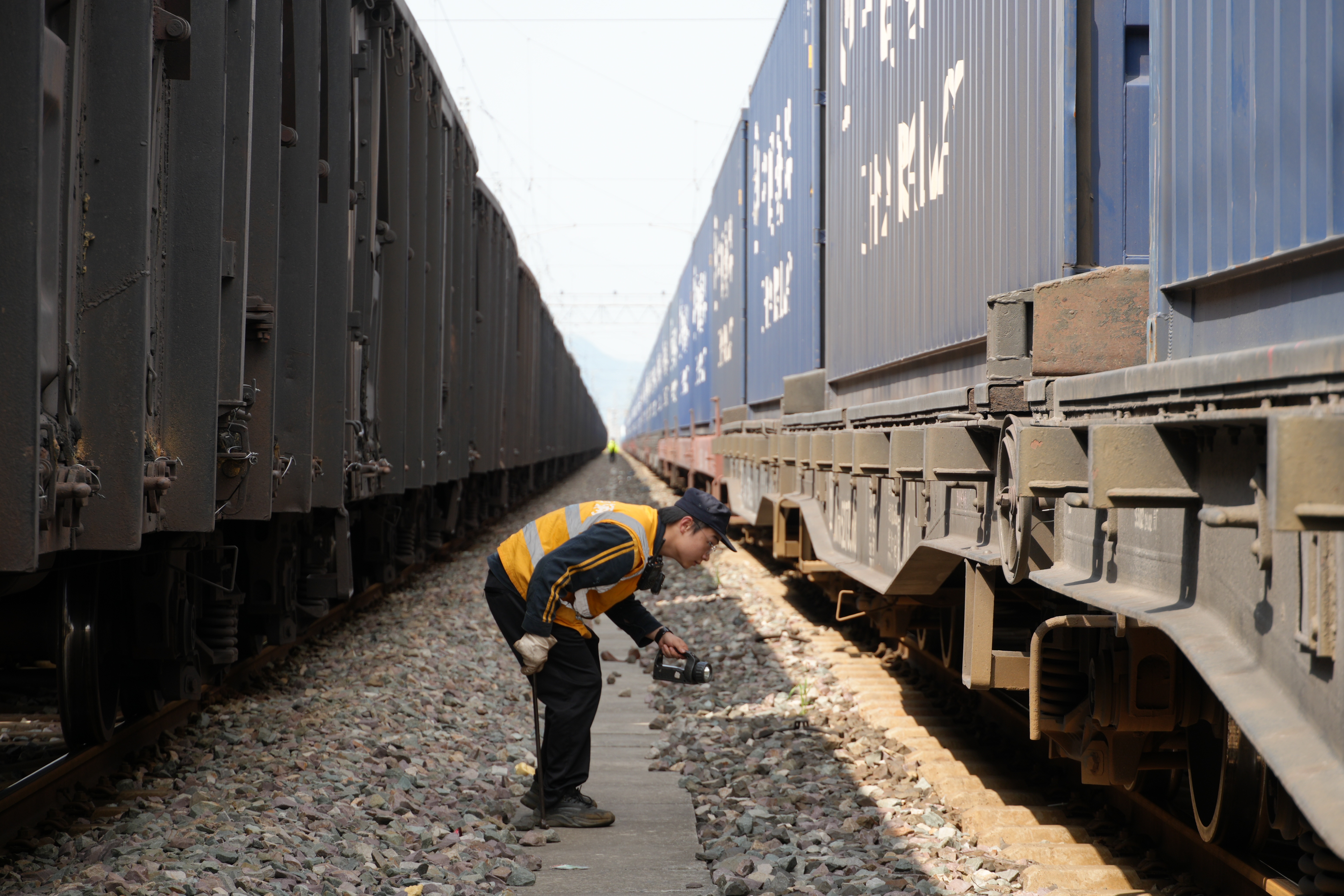 重庆西车辆段检车员正在对中欧班列关键部件进行细致检修