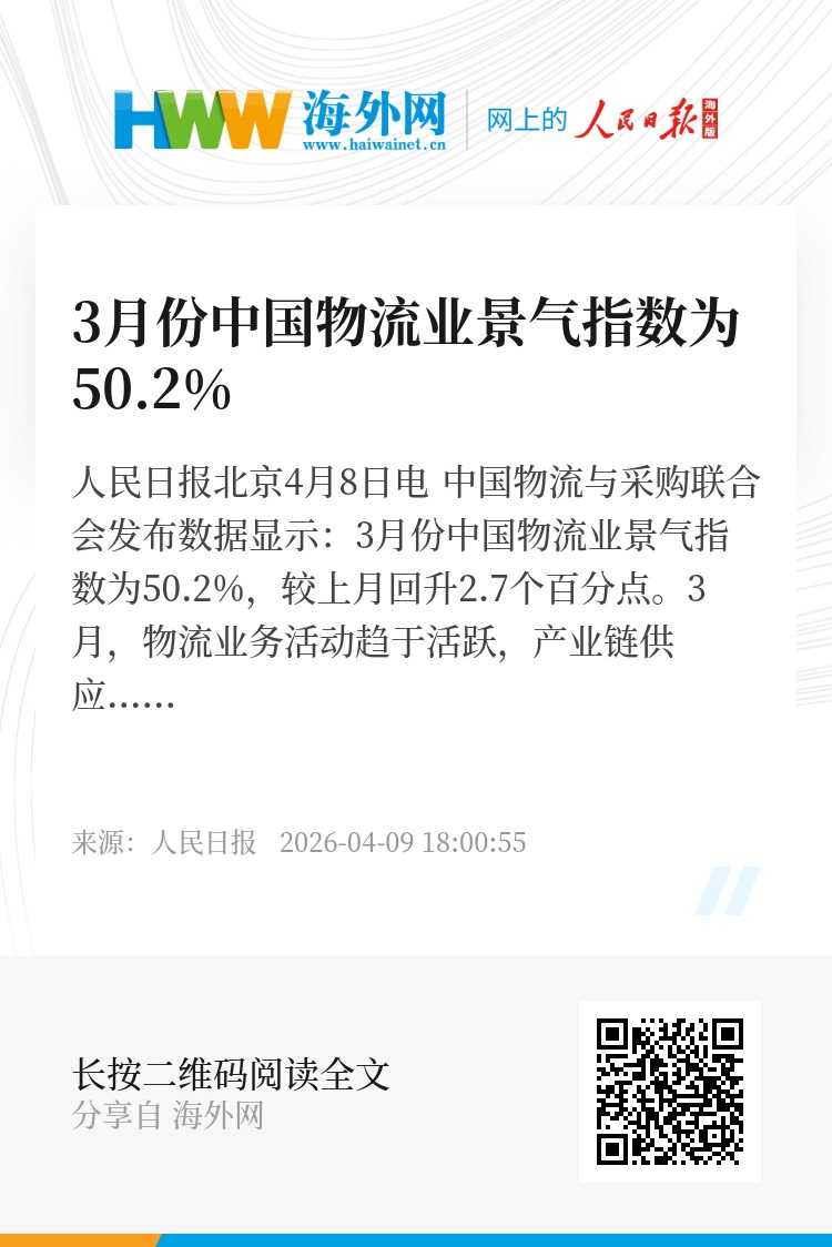 人民日报北京4月8日电 中国物流与采购联合会发布数据显示:3月份中国物流业景气指数为50.2%,较上月回升2.7个百分点。3月,物流业务活动趋于活跃,产业链供应链上下游协同推进,物流领域投资增长,市场预期同步向好。