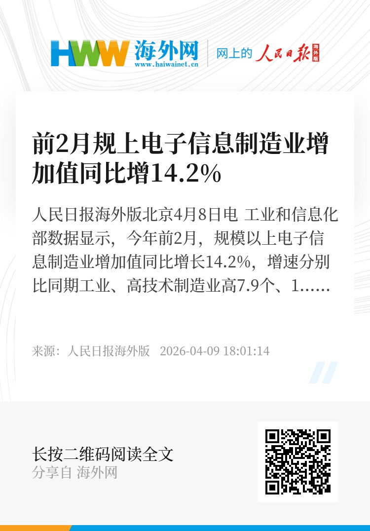 人民日报海外版北京4月8日电 工业和信息化部数据显示,今年前2月,规模以上电子信息制造业增加值同比增长14.2%,增速分别比同期工业、高技术制造业高7.9个、1.1个百分点,行业整体发展态势良好。