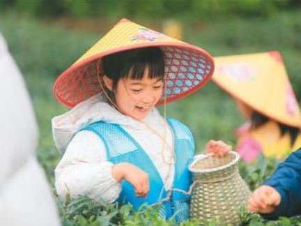 4月初,春假与清明小长假“牵手”,各地中小学生参加丰富多彩的活动,享受欢乐时光。图为小朋友在重庆市秀山土家族苗族自治县梅江镇兴隆坳现代农业园区茶叶示范基地采摘茶叶。