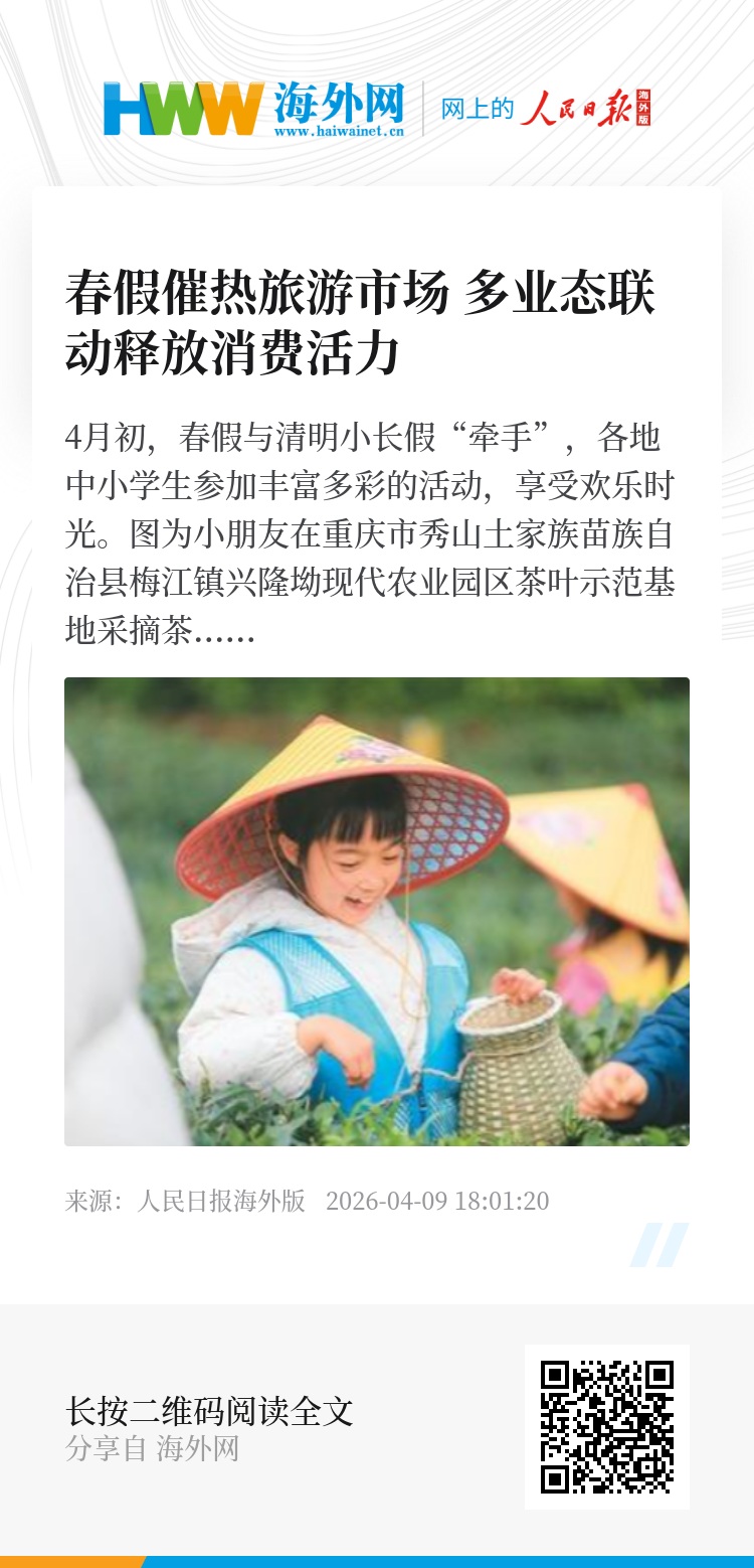 业内人士指出,春假与清明假期衔接,激活了广大群众出游需求,周边游、短途游、研学游显著升温,进一步释放消费活力。