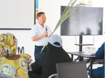 在位于卢旺达南方省胡耶区的中国援卢农业技术示范中心,林占熺为培训班学员讲解菌草技术。