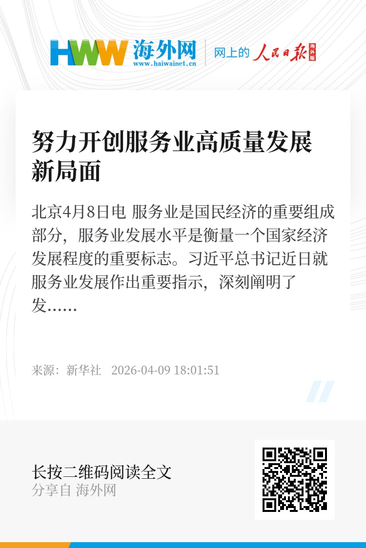 新华社北京4月8日电 服务业是国民经济的重要组成部分,服务业发展水平是衡量一个国家经济发展程度的重要标志。习近平总书记近日就服务业发展作出重要指示,深刻阐明了发展服务业的重大意义、重要原则、重点任务,具有很强的思想性、指导性、针对性,为更好促进服务业优质高效发展指明了方向、提供了重要遵循。