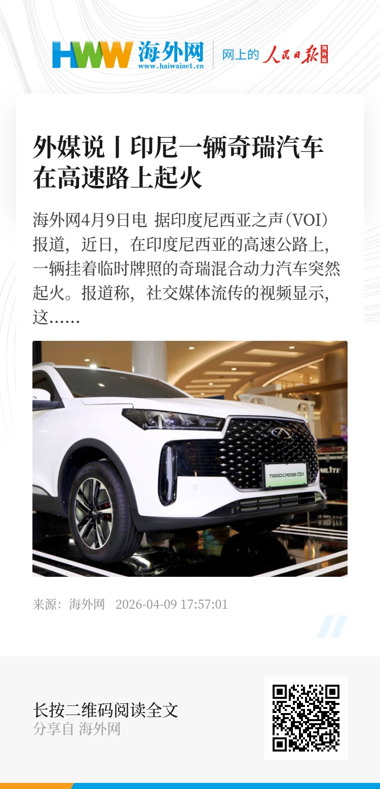 海外网4月9日电 据印度尼西亚之声(VOI)报道,近日,在印度尼西亚的高速公路上,一辆挂着临时牌照的奇瑞混合动力汽车突然起火。