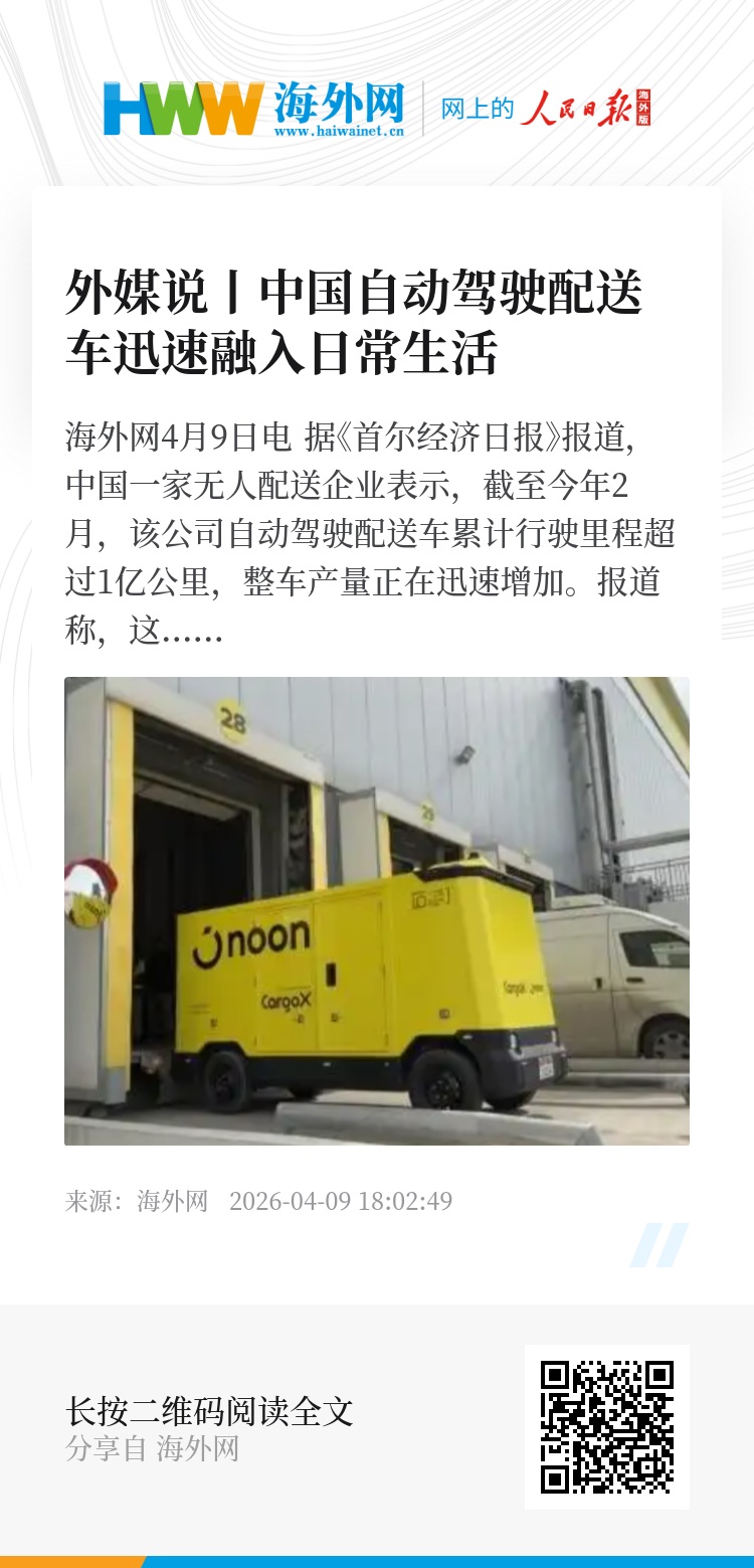 海外网4月9日电 据《首尔经济日报》报道,中国一家无人配送企业表示,截至今年2月,该公司自动驾驶配送车累计行驶里程超过1亿公里,整车产量正在迅速增加。