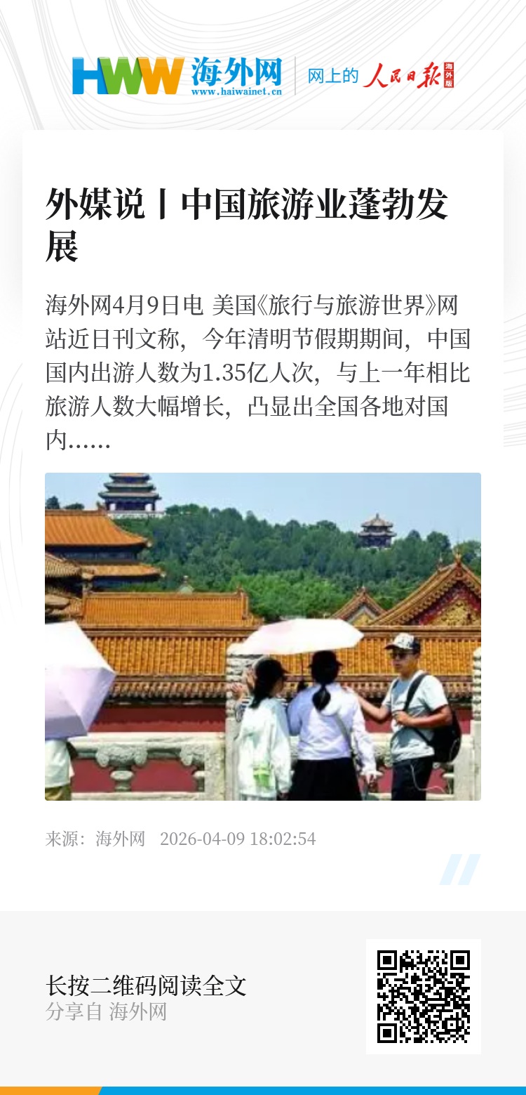 海外网4月9日电 美国《旅行与旅游世界》网站近日刊文称,今年清明节假期期间,中国国内出游人数为1.35亿人次,与上一年相比旅游人数大幅增长,凸显出全国各地对国内旅游的需求日益增长。