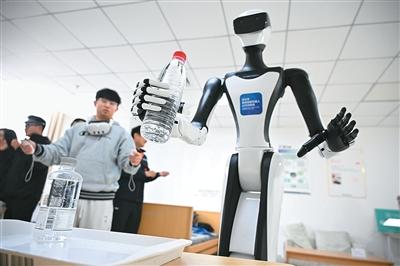 4月9日,在山东省青岛市康养领域具身机器人暨智能康复类产品训练验证中心,训练师在指导机器人练习抓取物体。