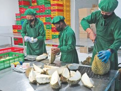 为拓宽国际市场,印尼各级政府加强榴莲产品质量监管与产业配套建设,要求出口榴莲原料来自获得全球良好农业操作认证的果园,符合食品安全、植物检疫等国际标准,并推动建设体现国际规范的包装厂和冷链物流设施。在阿玉的榴莲园,榴莲采摘后会被运往约两公里外的加工厂。“在工人按等级逐一筛选后,榴莲还要经历一系列严格流程,包括清洗、剥壳、分级、快速冷冻和包装,最后贴上出口标签,装入冷链集装箱运往港口。”阿玉说,为开拓海外市场,工厂在2023年投资购置了风冷式冷冻设备和冷藏设施,通过严格的质量控制、卫生管理和快速冷冻技术,尽量保留榴莲原有的风味和口感。