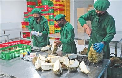 傍晚时分,一辆集装箱卡车缓缓驶入加工厂,工人们将一箱箱包装好的冷冻榴莲整齐码放进集装箱。“从这里开车大约两个半小时就能到港口。”阿玉表示,货物装船出海约10天后,这些榴莲即可抵达中国。