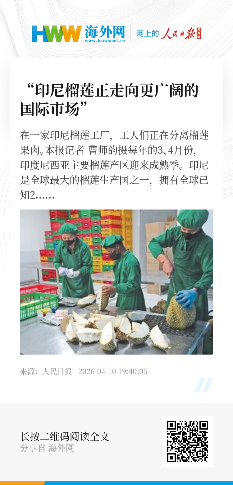 2023年以后,阿玉的公司开始向中国市场出口冷冻榴莲。此前,这些榴莲需先运至泰国进行标准化加工,再转运至中国,运输成本较高、周期也长。2025年5月,印尼与中国签署了冷冻榴莲输华协议,印尼冷冻榴莲正式获准直接出口中国。今年2月,阿玉的公司向中国出口了首批冷冻榴莲,共计27吨、价值21亿印尼盾(1元人民币约合2500印尼盾)。“运输环节减少后,成本降低了约一半,榴莲品质也更有保障。”阿玉说,“中国市场是全球最大的榴莲市场,给印尼榴莲种植户和出口商带来巨大机遇,同时促进了整个榴莲产业在质量标准、加工技术和出口能力方面的提升。期待未来更多印尼榴莲进入中国。”
