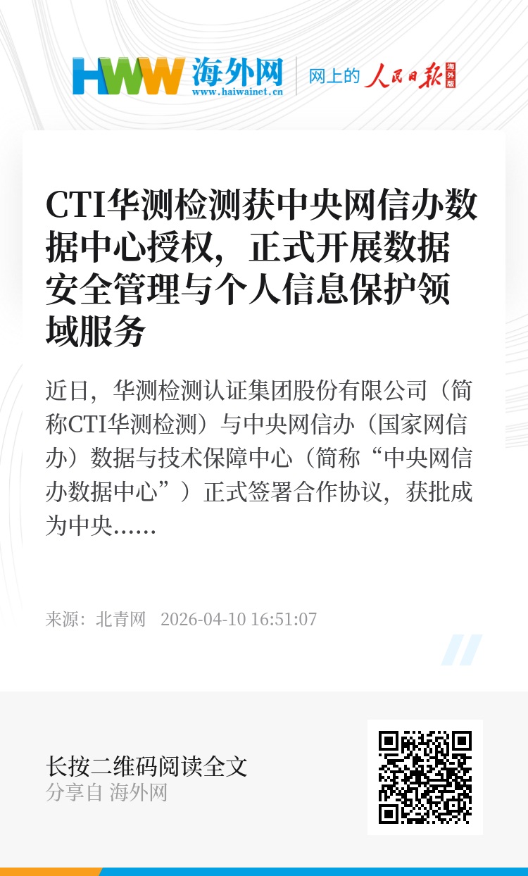 近日,华测检测认证集团股份有限公司(简称CTI华测检测)与中央网信办(国家网信办)数据与技术保障中心(简称“中央网信办数据中心”)正式签署合作协议,获批成为中央网信办数据中心在数据安全管理(DSM)认证与个人信息保护(PIP)认证领域的授权技术验证机构。标志着CTI华测检测正式纳入国家数据安全合规技术支撑体系,将在中央网信办数据中心指导下,承担技术验证重任,助力企业筑牢数据安全防线。作为独立的第三方检测认证机构,CTI华测检测将严格遵循国家认证规范,开展DSM/PIP认证的技术验证工作,推动企业数据安全与个人信息保护合规水平全面提升。