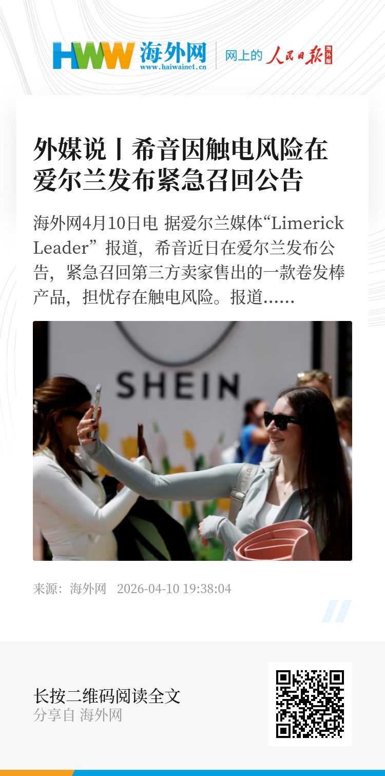 海外网4月10日电 据爱尔兰媒体“Limerick Leader”报道,希音近日在爱尔兰发布公告,紧急召回第三方卖家售出的一款卷发棒产品,担忧存在触电风险。