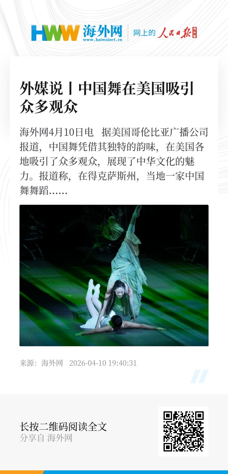 海外网4月10日电 据美国哥伦比亚广播公司报道,中国舞凭借其独特的韵味,在美国各地吸引了众多观众,展现了中华文化的魅力。