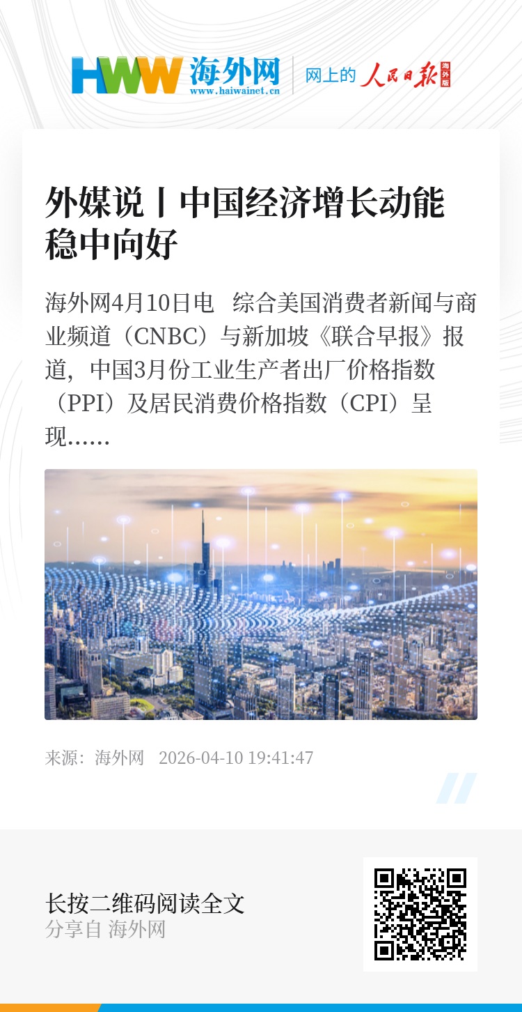 海外网4月10日电 综合美国消费者新闻与商业频道(CNBC)与新加坡《联合早报》报道,中国3月份工业生产者出厂价格指数(PPI)及居民消费价格指数(CPI)呈现同比上涨态势。分析指出,中国凭借丰富的战略物资储备与多元化的能源供给结构,为国内经济抵御外部价格波动提供了一定缓冲空间。美国金融服务公司摩根士丹利的一位经济学家表示,在当前全球能源市场面临冲击的背景下,中国在能源可替代性与政策应对空间方面展现出的灵活性,优于其他国家。(石雯欣)