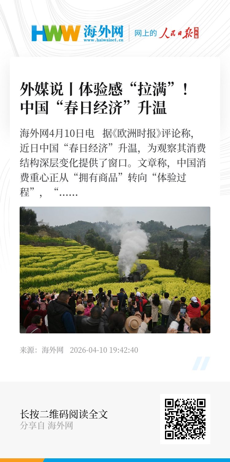 海外网4月10日电 据《欧洲时报》评论称,近日中国“春日经济”升温,为观察其消费结构深层变化提供了窗口。