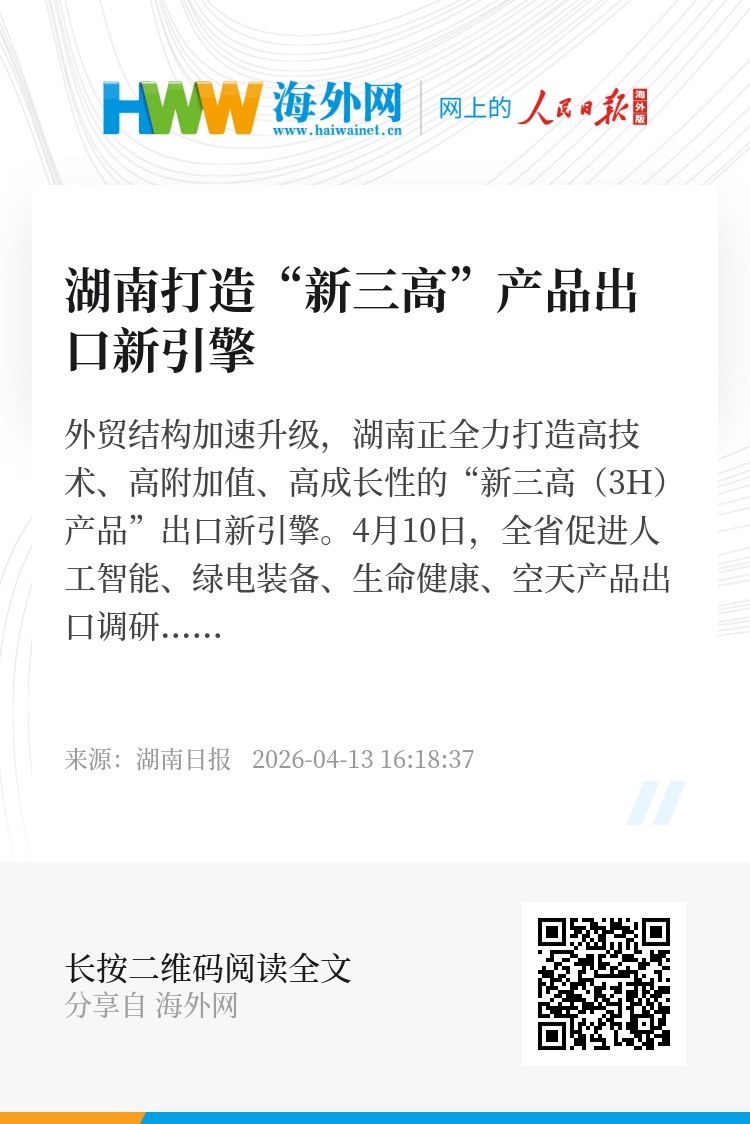 外贸结构加速升级,湖南正全力打造高技术、高附加值、高成长性的“新三高(3H)产品”出口新引擎。4月10日,全省促进人工智能、绿电装备、生命健康、空天产品出口调研及现场推进会在浏阳召开,系统部署3H产品出口提质增效行动,奋力构建湖南外贸新增长极。