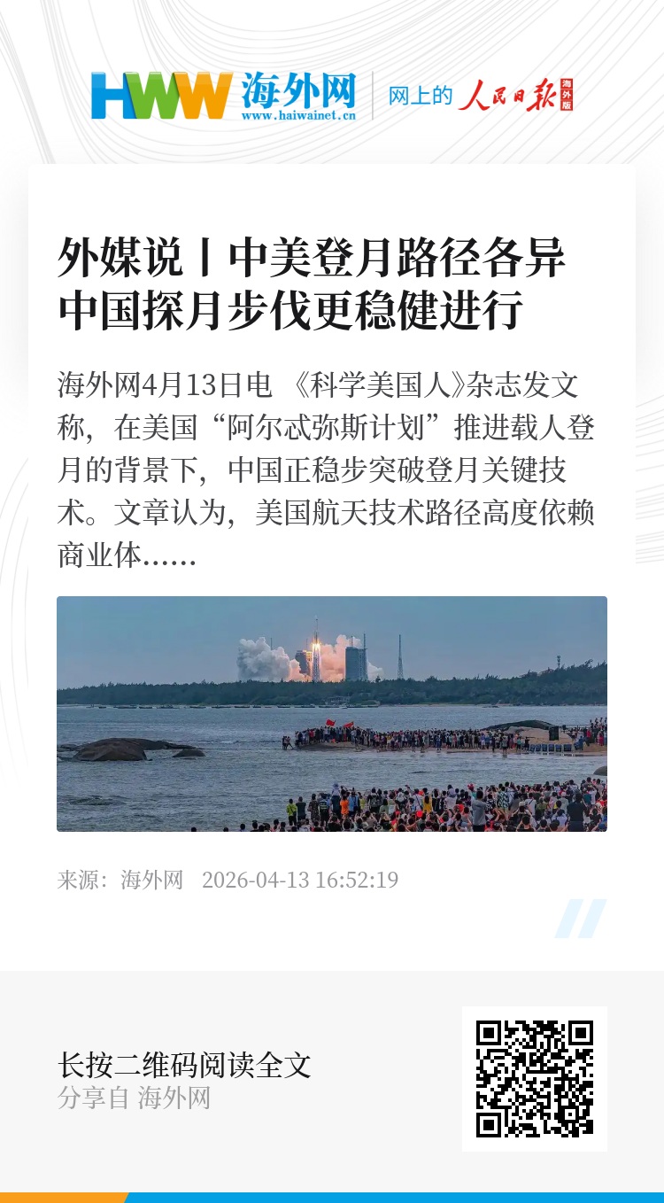 海外网4月13日电 《科学美国人》杂志发文称,在美国“阿尔忒弥斯计划”推进载人登月的背景下,中国正稳步突破登月关键技术。