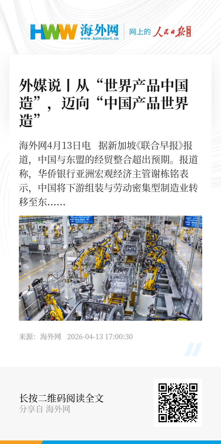 海外网4月13日电 据新加坡《联合早报》报道,中国与东盟的经贸整合超出预期。
