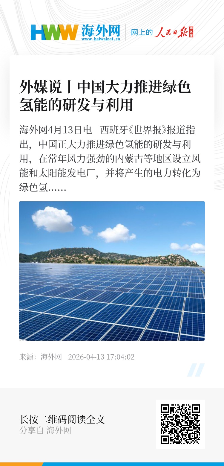海外网4月13日电 西班牙《世界报》报道指出,中国正大力推进绿色氢能的研发与利用,在常年风力强劲的内蒙古等地区设立风能和太阳能发电厂,并将产生的电力转化为绿色氢气。绿色氢能的大面积推广,不仅能减少污染排放,更能促使中国形成稳定的能源格局,实现能源自给自足。(孙橙橙)