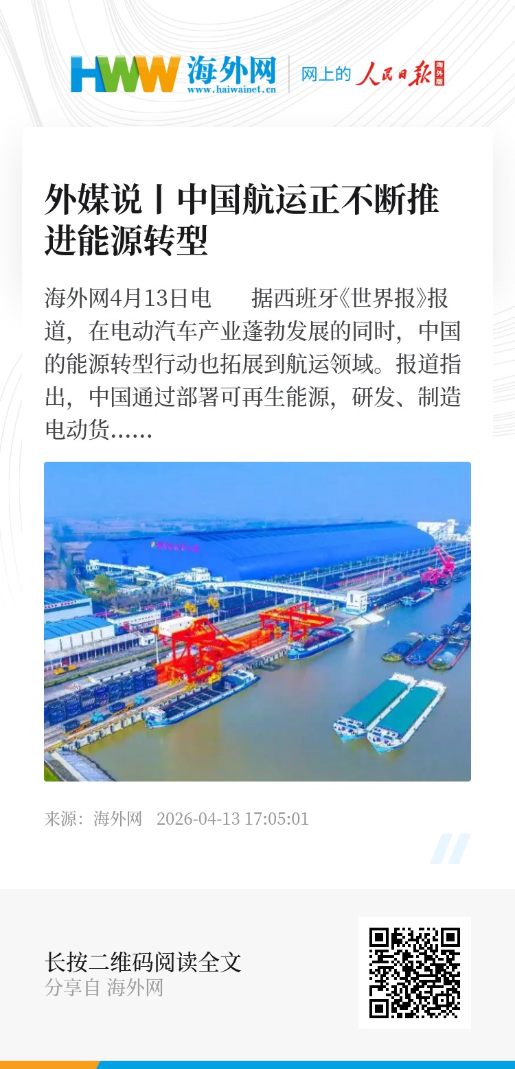 海外网4月13日电 据西班牙《世界报》报道,在电动汽车产业蓬勃发展的同时,中国的能源转型行动也拓展到航运领域。