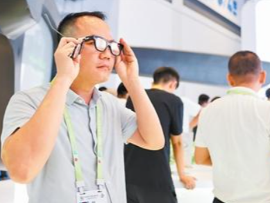 观众在第六届消博会科技消费展区体验乐奇AI眼镜。