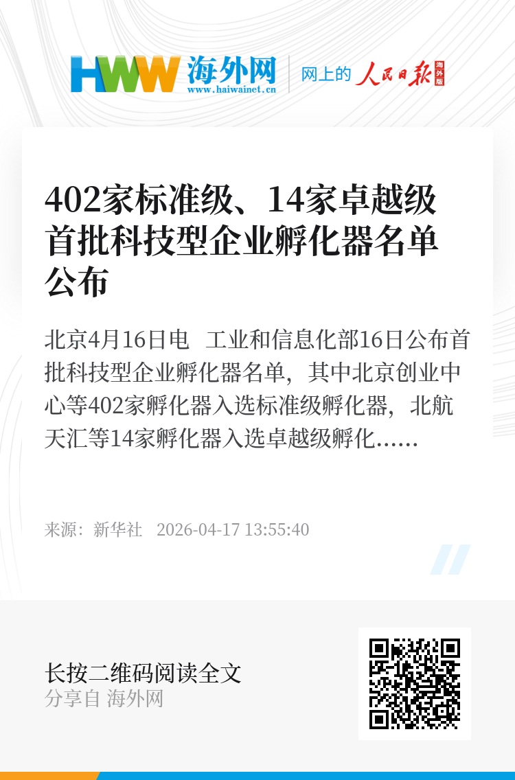新华社北京4月16日电 工业和信息化部16日公布首批科技型企业孵化器名单,其中北京创业中心等402家孵化器入选标准级孵化器,北航天汇等14家孵化器入选卓越级孵化器。