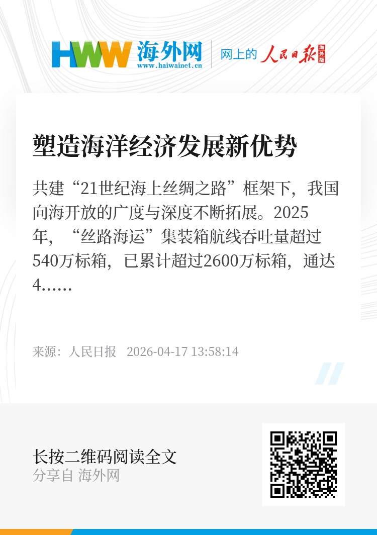 共建“21世纪海上丝绸之路”框架下,我国向海开放的广度与深度不断拓展。2025年,“丝路海运”集装箱航线吞吐量超过540万标箱,已累计超过2600万标箱,通达48个国家和地区的150座港口。这不仅是海洋经济深度融入全球产业链的生动缩影,更彰显出海洋合作的强劲势能与广阔前景。